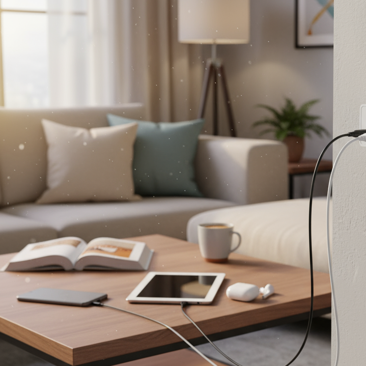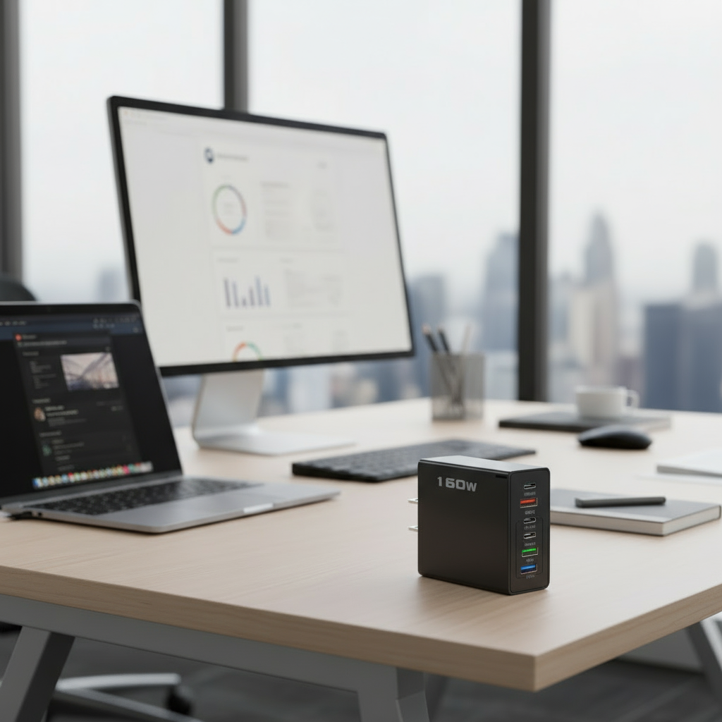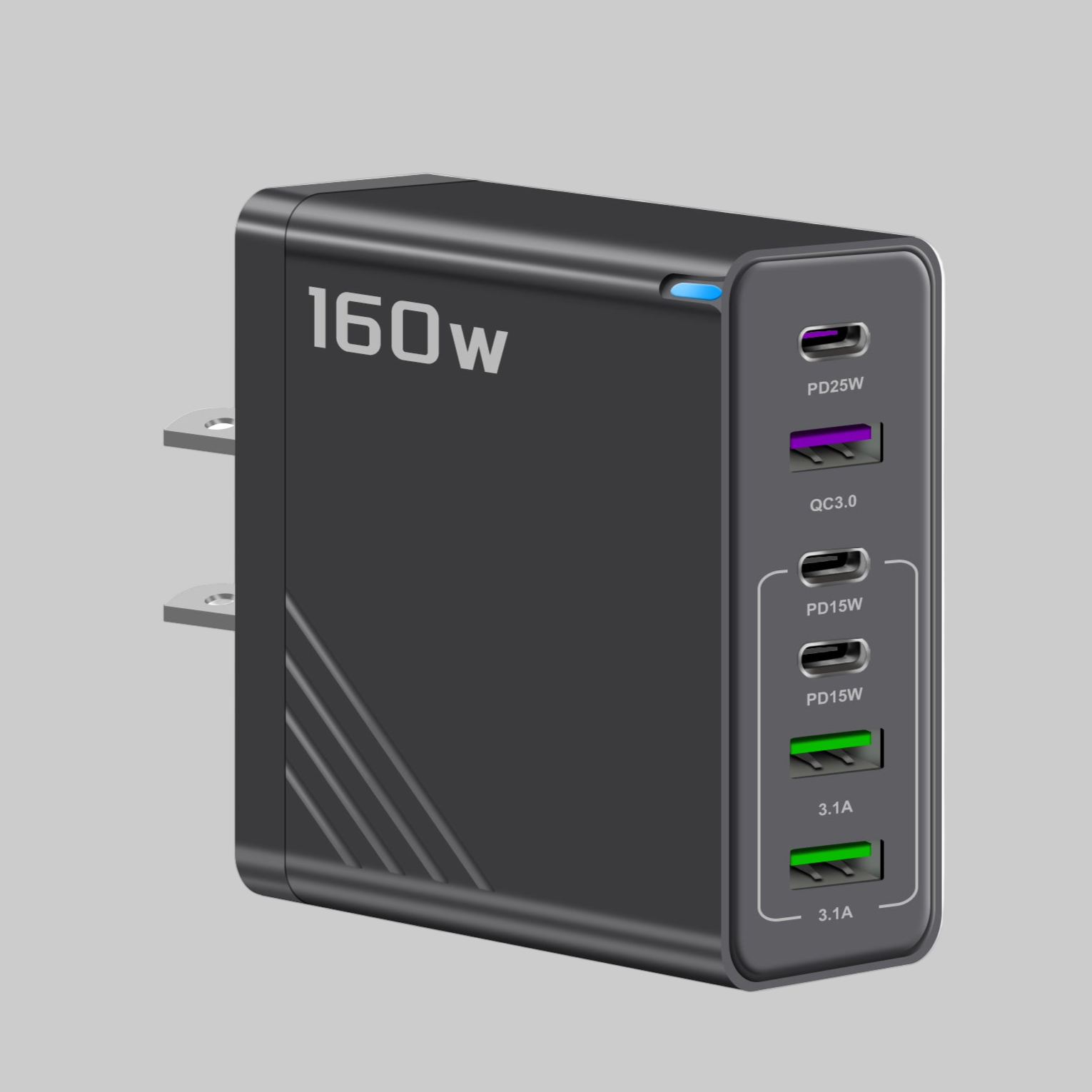 This sleek black charging station features 6 outlets: 3 USB Type-A and 3 Type-C ports, 3A Current, delivering up to 160W of total power. Its advanced electronic control stabilizes power for fast, efficient, and safe charging of all your cell phones, tablets, and laptops