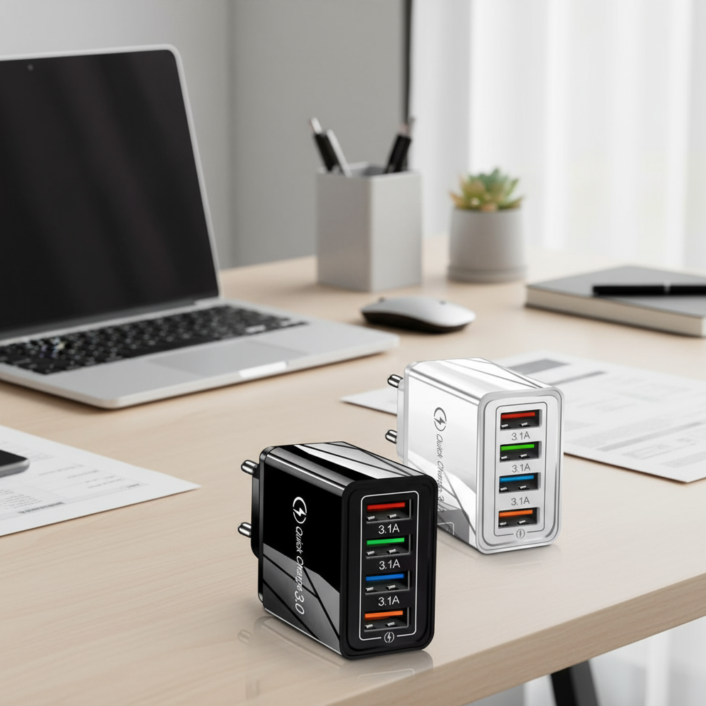 Charge multiple devices simultaneously with this powerful 20W wall charger featuring four USB outlets