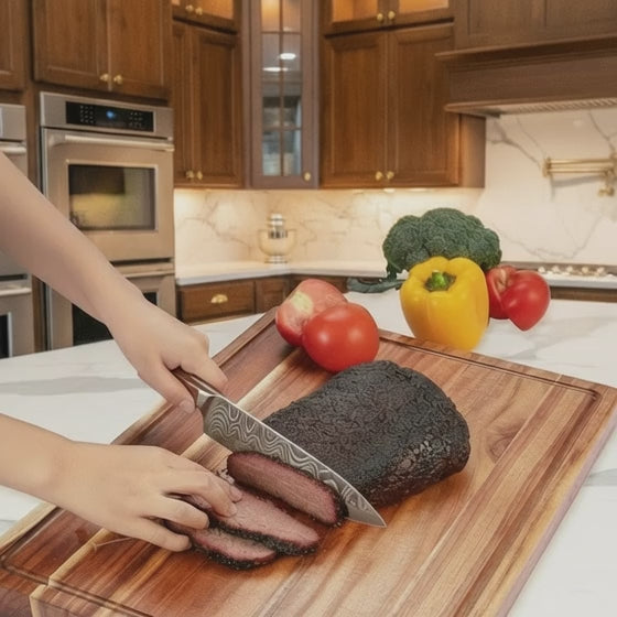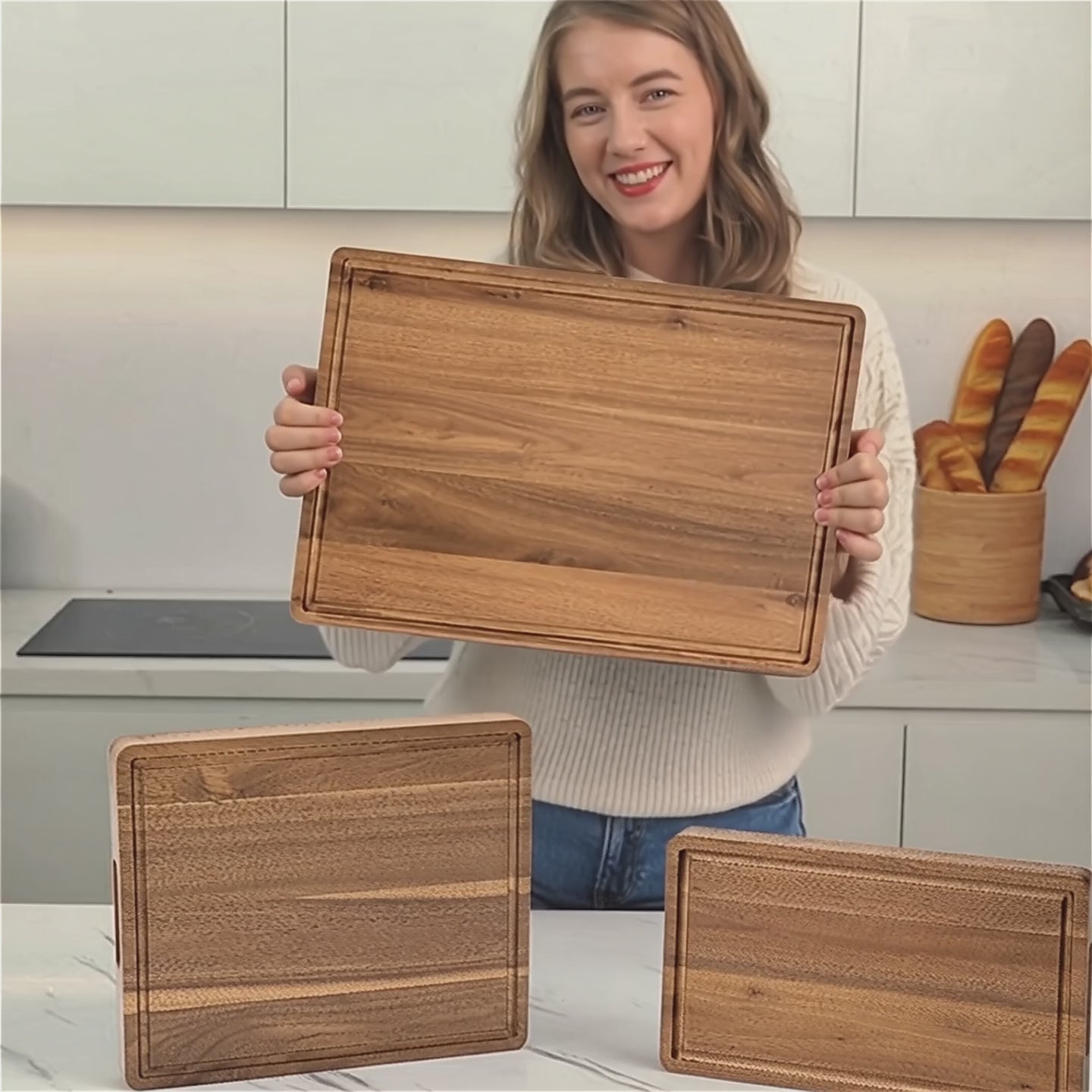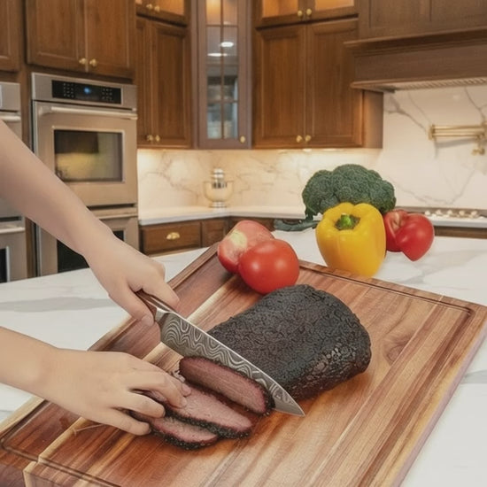 Three beautifully crafted boards, each equipped with a juice-catching groove and comfortable handle, work seamlessly together for all your food preparation and presentation needs. The matching storage holder keeps your set organized and ready to impress