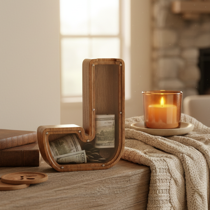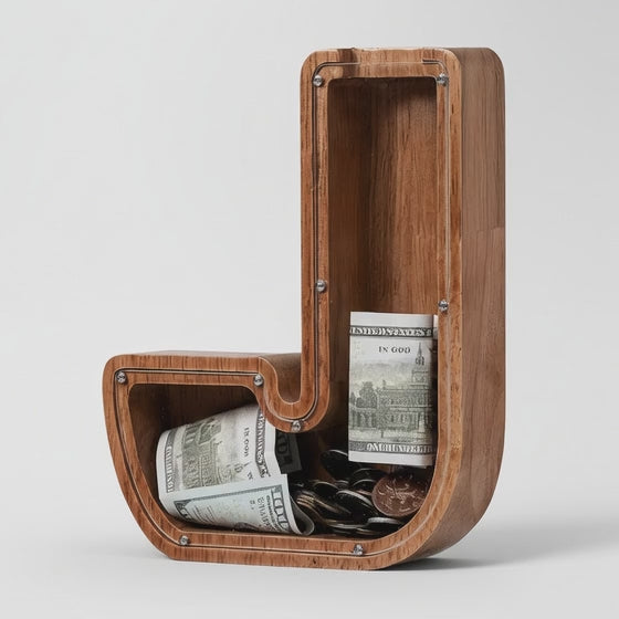 This 9-inch-tall money bank, featuring the letter "J," makes a charming addition to any child's room or home decor