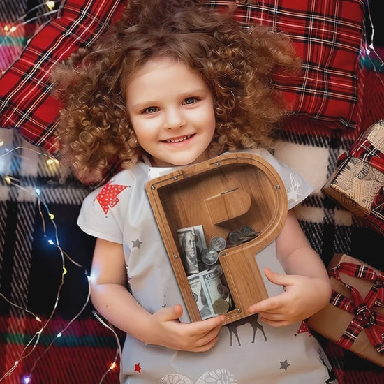 This Alphabet Money Bank featuring the initial "P" stands 9 inches tall and makes a charming addition to any child's room or home decor