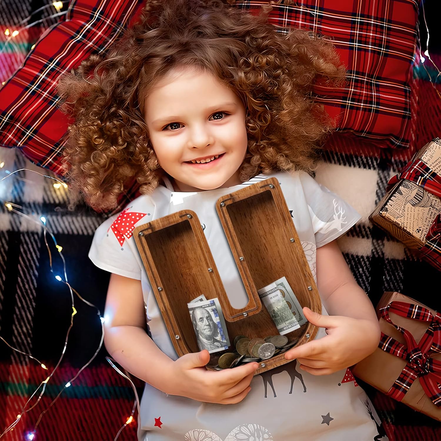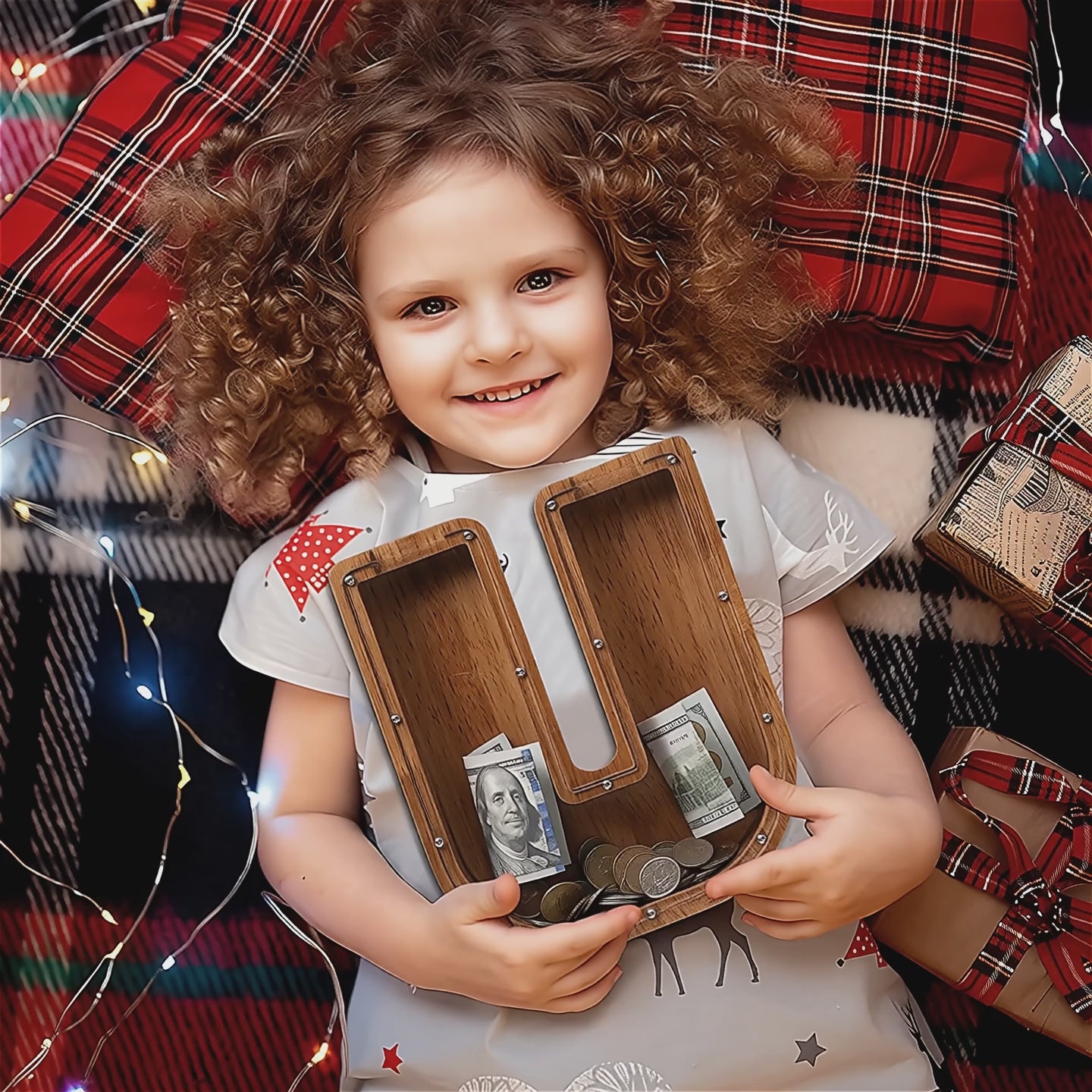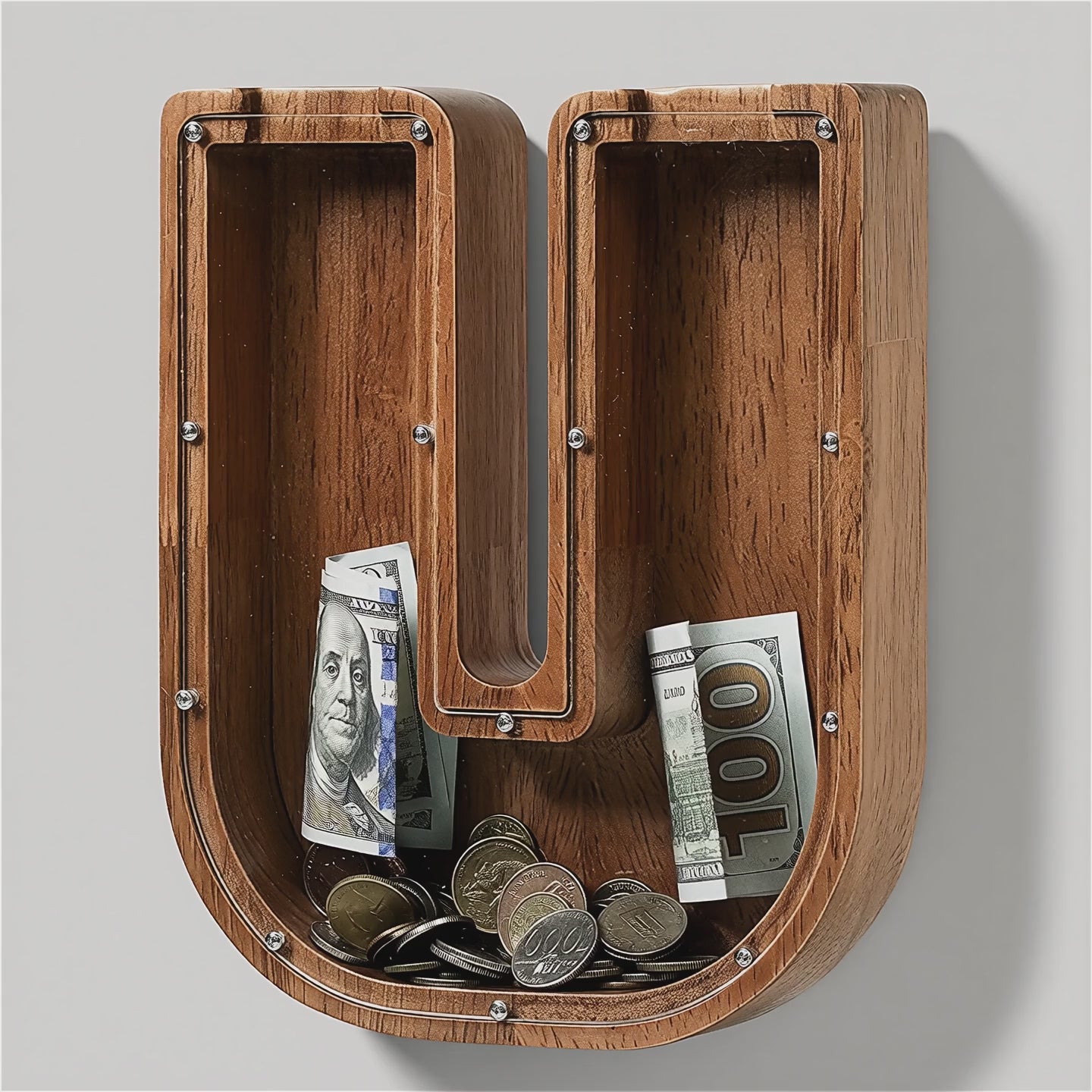 This piggy bank makes a delightful gift for kids or a charming piece of home decor. Featuring the initial "U," it serves as a personalized coin box perfect for birthdays or any special event