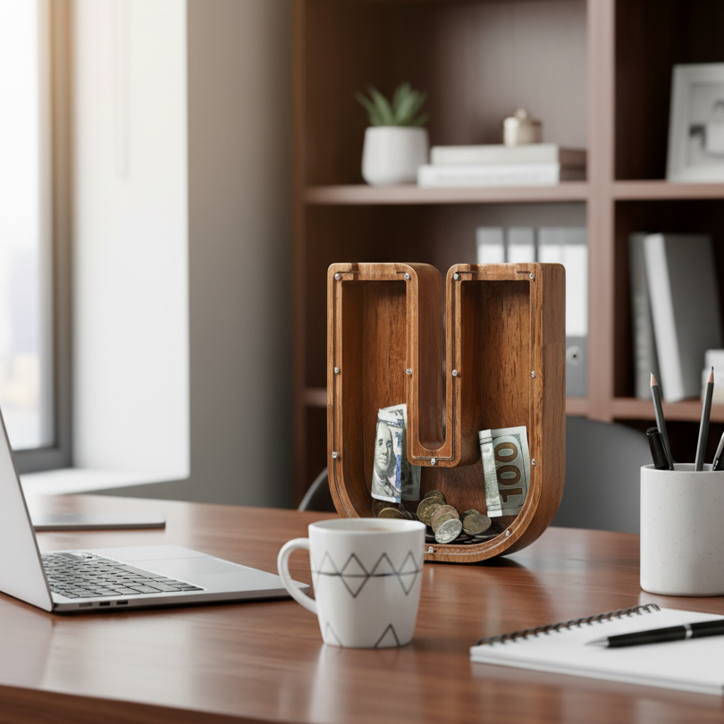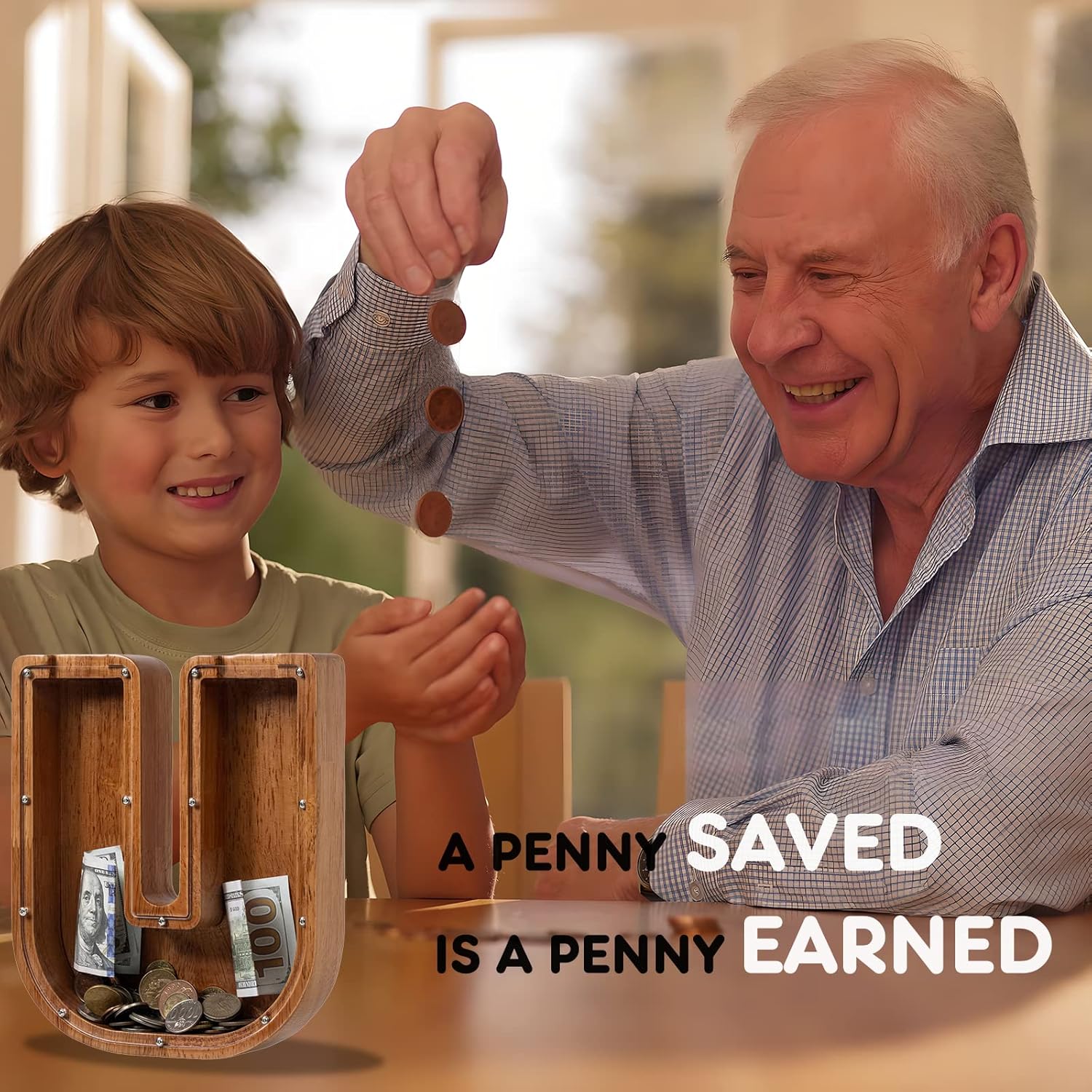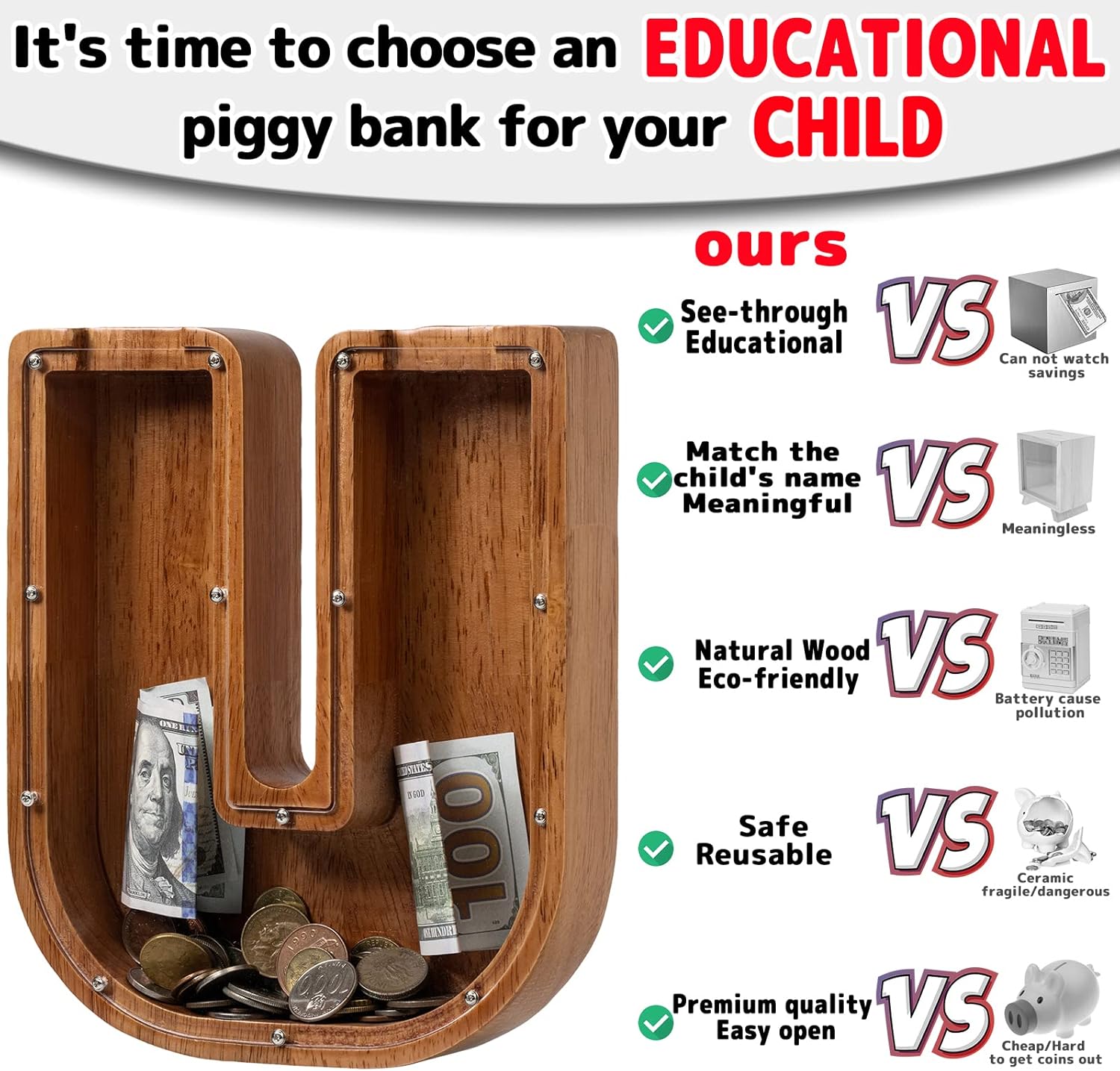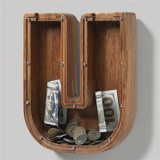 This piggy bank makes a delightful gift for kids or a charming piece of home decor. Featuring the initial "U," it serves as a personalized coin box perfect for birthdays or any special event
