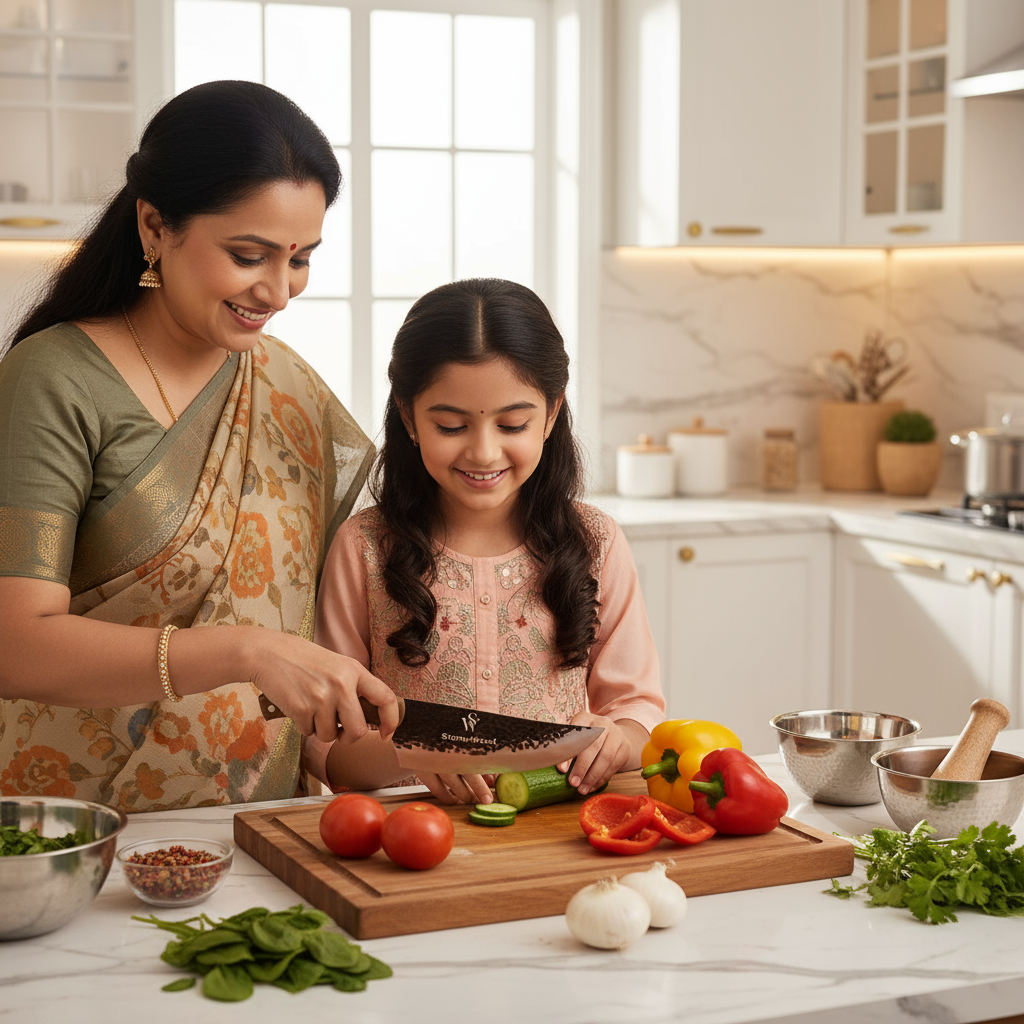 With a sturdy 3mm thickness, it offers the perfect edge for tackling all meats and vegetables. The handle, crafted from solid teak hardwood, delivers toughness and a secure grip