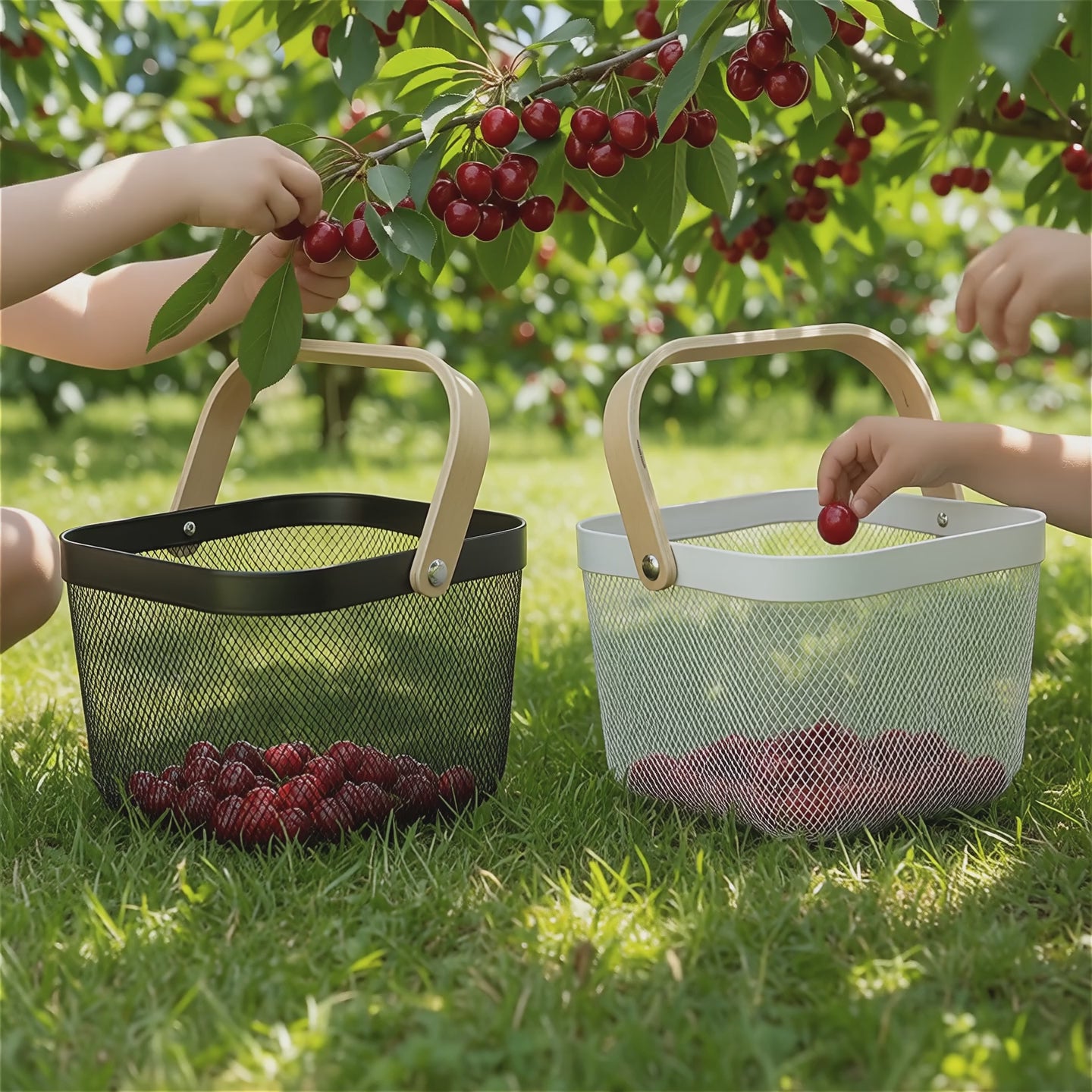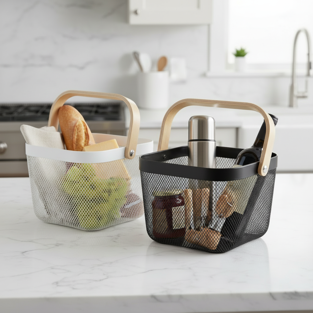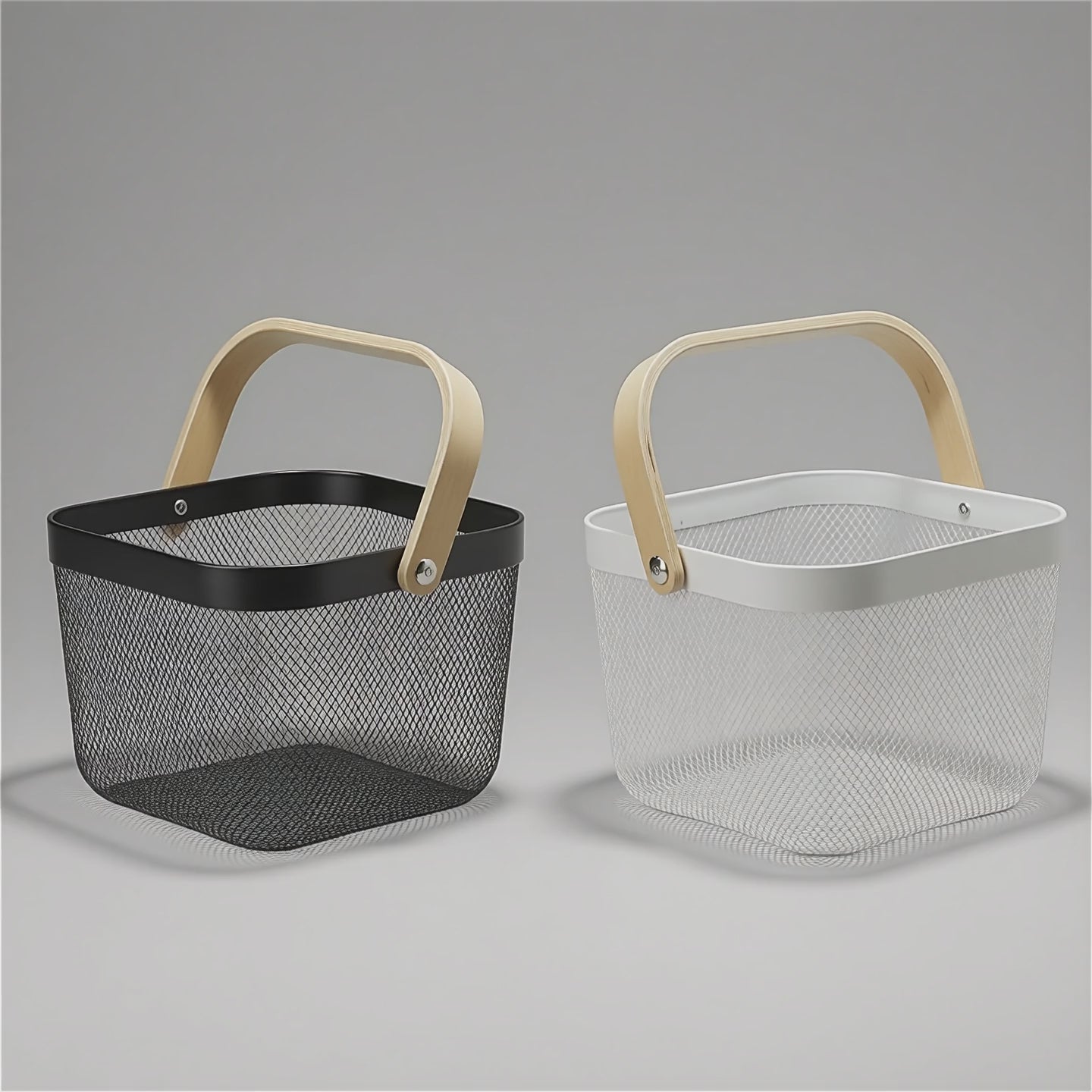 Organize your space with this versatile 12-quart storage basket that combines natural materials with practical design. Featuring sturdy metal mesh construction paired with a Rattan Wood handle, it's perfect for any household storage needs, outdoor adventures, or creative projects
