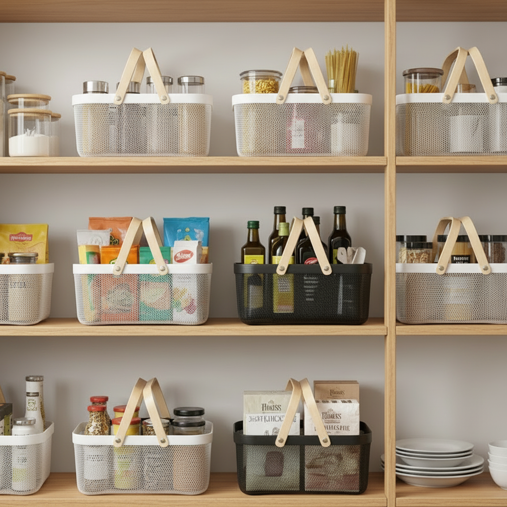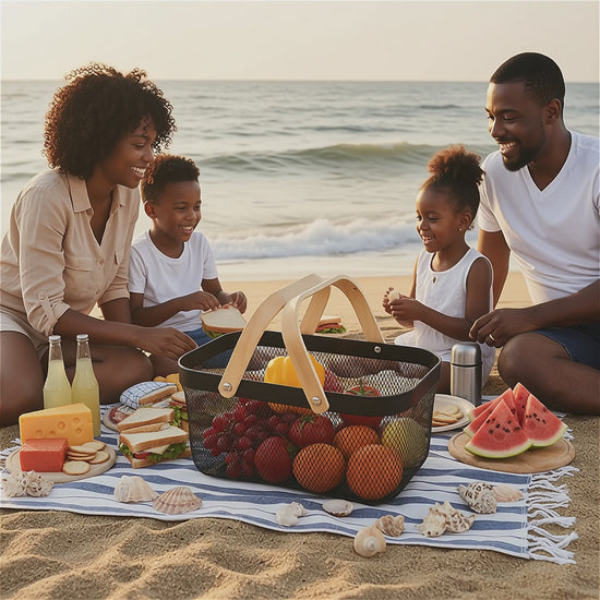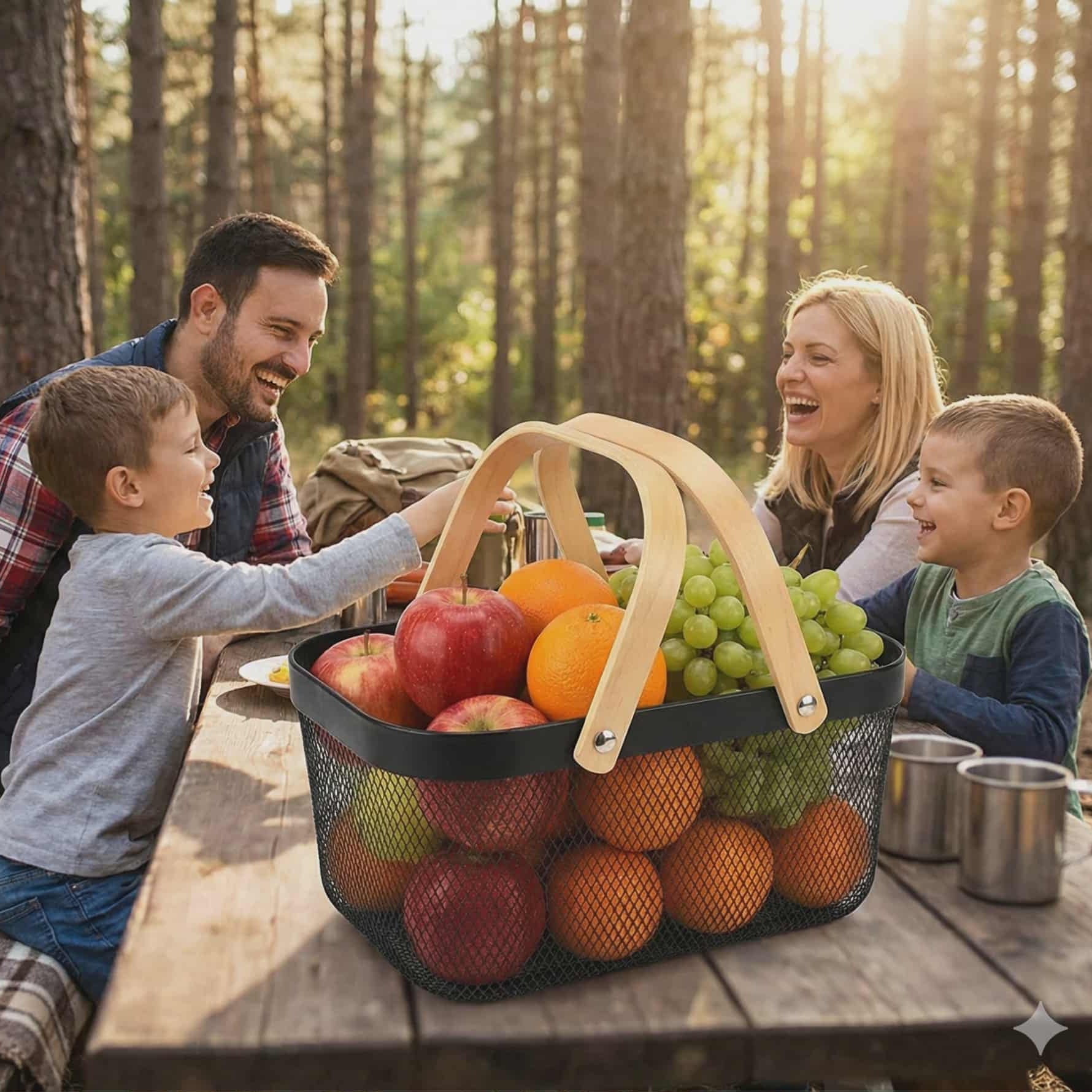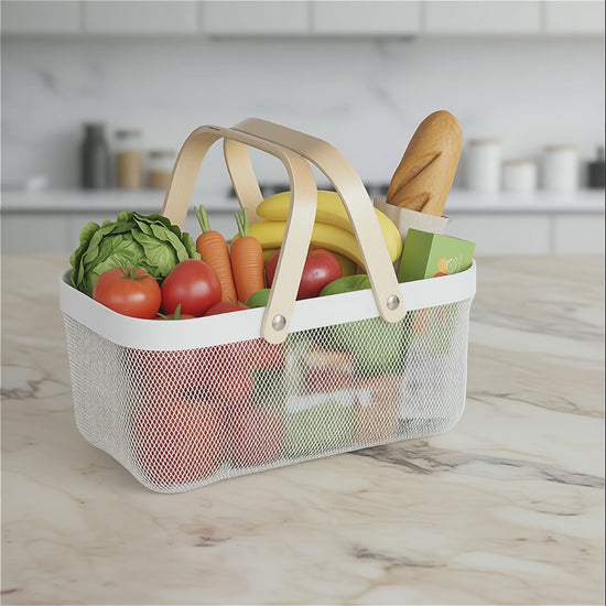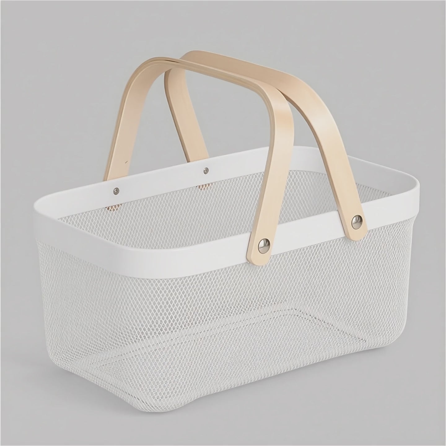 Organize your space with this versatile 18-quart storage basket that combines natural materials with practical design. Featuring sturdy metal mesh construction paired with Rattan Wood handles, it's perfect for kitchen storage, outdoor adventures, or creative projects