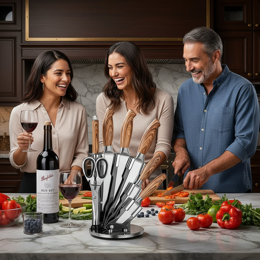 Elevate your culinary experience with this comprehensive 8-piece stainless steel knife collection. Featuring sleek, modern aesthetics paired with genuine functionality, this set delivers everything you need for everyday meal preparation