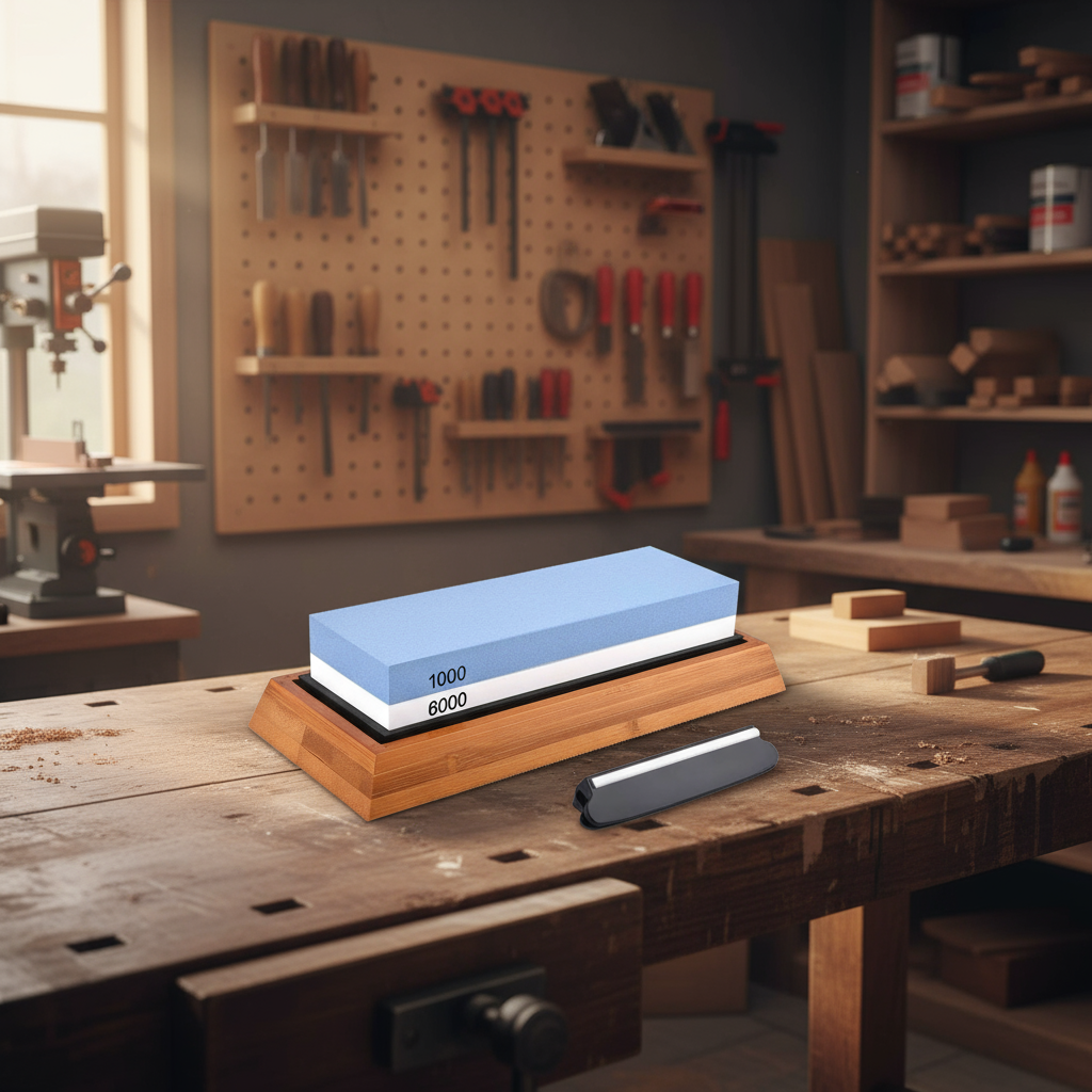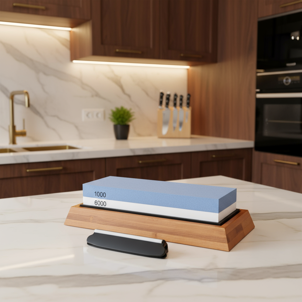 This premium Knife Sharpening Water Stone features a natural wet stone with 1000/6000 grit, mounted on a non-slip bamboo base for stability