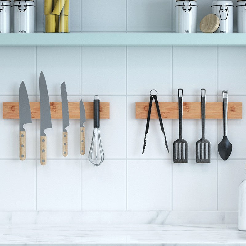 Mount this 16" Magnetic Knife Holder, made from natural Acacia hardwood, on your wall for bold kitchen organization.