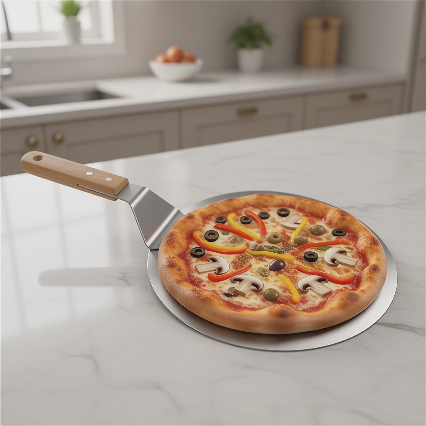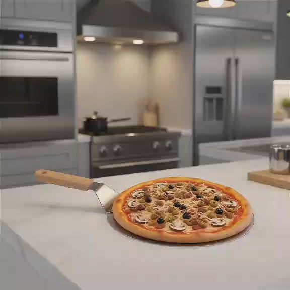 Crafted from premium food-grade stainless steel, this round pizza shovel delivers the perfect blend of durability and performance. The ergonomic Rubberwood handle provides a secure, comfortable grip, keeping your hands safe as you retrieve piping-hot pizzas from the oven
