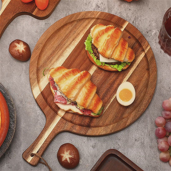 Elevate your kitchen with this stunning acacia hardwood serving board, a versatile essential that transitions seamlessly from meal prep to tabletop presentation