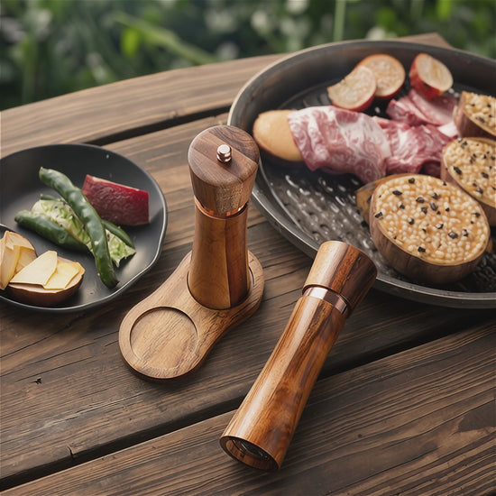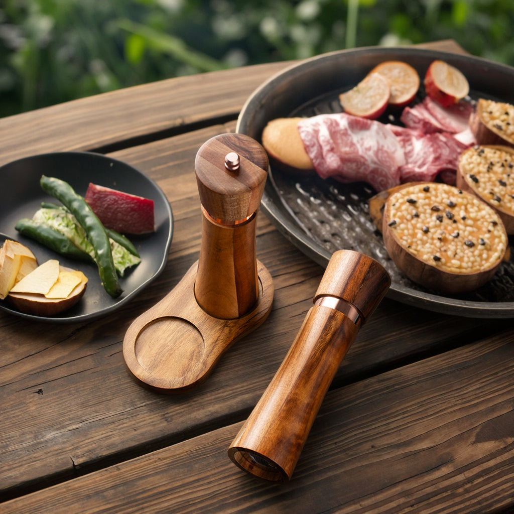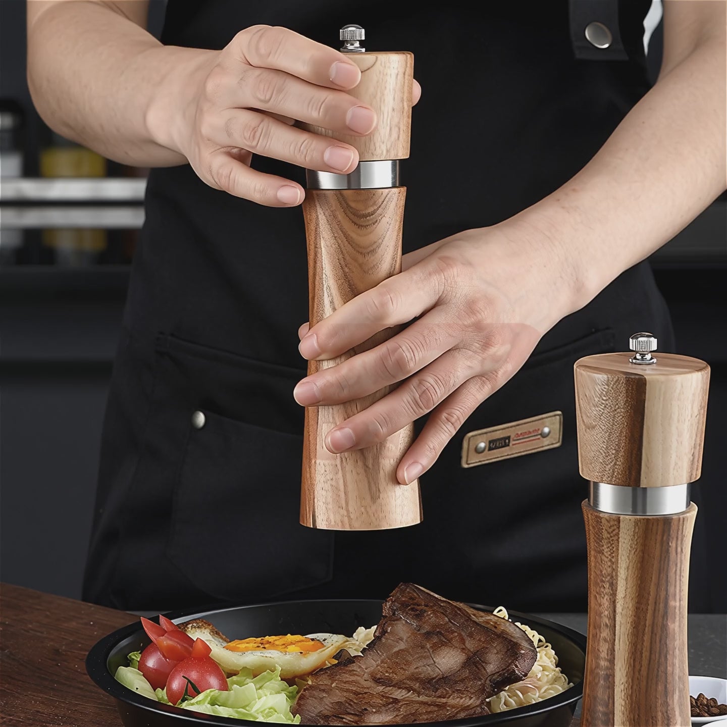 Elevate your spice preparation with this premium two-piece mill set crafted from durable Acacia hardwood. Each 8-inch grinder features a stainless steel ring accent and precision ceramic grinding mechanisms that adjust to your preferred consistency