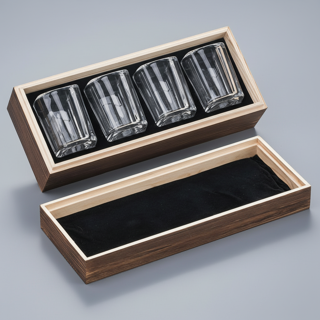 Elevate your spirit-tasting experience with this sophisticated 4-piece square shot glass collection. This set comes with the painwood gift box