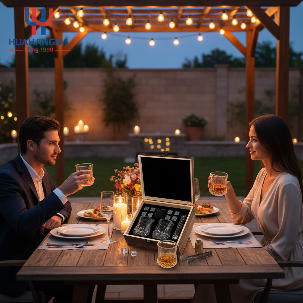 The complete set arrives in an elegant wooden presentation box, making it an unforgettable gift for whisky lovers and cocktail connoisseurs alike