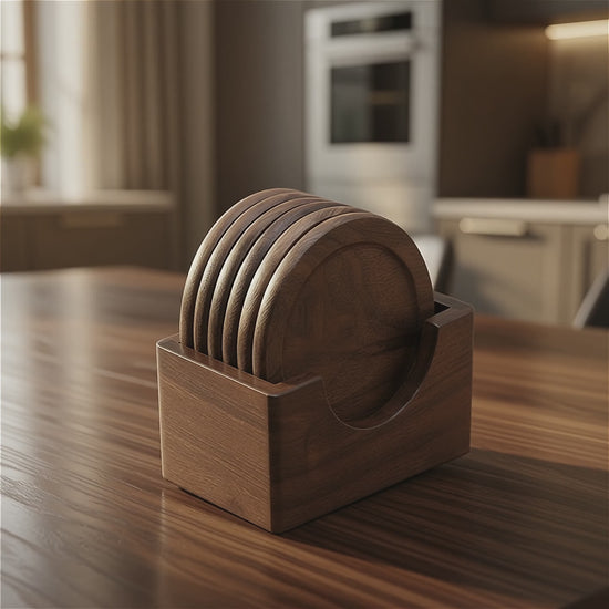 This striking set includes 6 wooden coasters plus a sleek holder, expertly crafted from authentic walnut hardwood